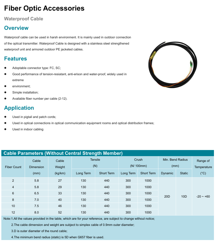Waterproof cable can be used in harsh environment. It is mainly used in outdoor connection of the optical transmitter. Waterproof Cable is designed with a stainless steel strengthened waterproof unit and armored outdoor PE jacketed cables.