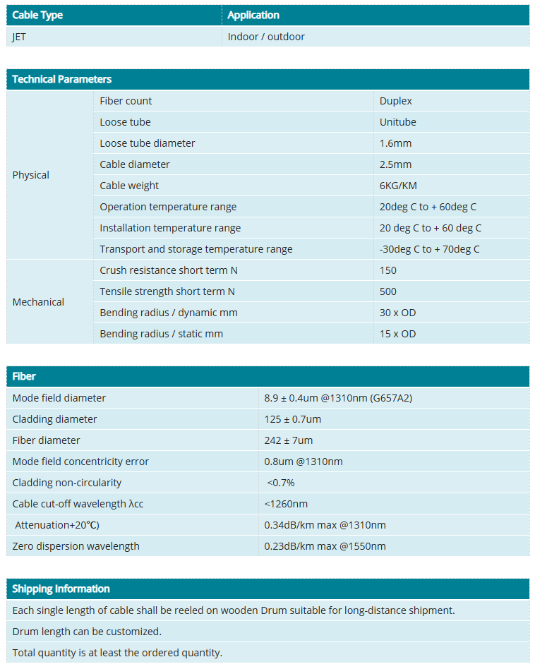 The fibers are positioned in a loose tube made of a high modulus plastic. The tubes are filled with a water-resistant filling gel. A layer of aramid yarn is applied around the cable core as additional strength member. Then, the cable is completed with a black PE outer sheath. The optical fiber is made of high pure silica and germanium doped silica. UV curable acrylate material is applied over fiber cladding as optical fiber primary protective coating. The detailed data of optical fiber performance are shown in the following table.